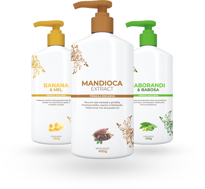 Mandioca Extract. Rico em Sais Minerais e Glicídios, promove o brilho, maciez e hidratação. Totalmente livre de parabenos.